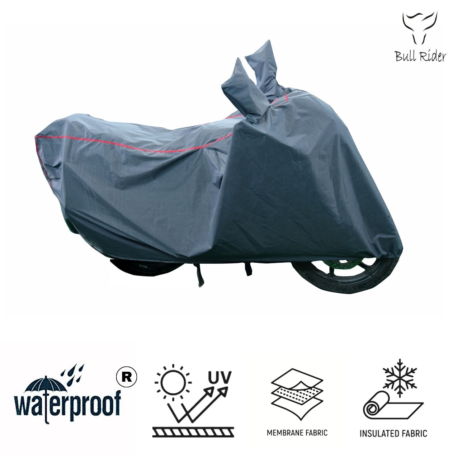 Bull Rider 100% Waterproof Bike Body Cover Supersoft. UV Protected Weather Proof Dust Proof With Soft Lining Inside Mirror Pocket Elastic Bottom. If you are looking for strong, effective and all weather bike covers for your vehicle, this is the right product. These two wheeler covers are very tough and long lasting. Highly durable and long lasting material protects your vehicle against wet, humid and dusty climatic conditions. Hi-performance water proof fabric naturally resists moisture, fungus and expels stale odor. Triple stitching mechanism with high quality imported threads used to stitch the cover tight and securely.